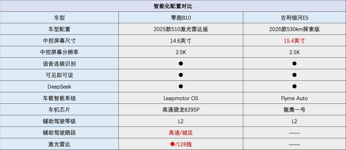 在辅助驾驶层面也是同样的道理,两款车型虽说都是L2级别的辅助驾驶,但零跑B10在硬件层面配备了128线的激光雷达以及高通8650辅助驾驶芯片,可以实现高速和城区的辅助驾驶功能,包括辅助泊车、辅助变道、辅助进出匝道等功能。而吉利银河E5仅仅靠单目摄像头,只能够实现基础的L2级辅助驾驶,两款车型之间的辅助驾驶的实际体验方面的差距,还是非常明显的。同时零跑B10在足够强硬件性能的支持下,后期的升级上限自然也更高。
